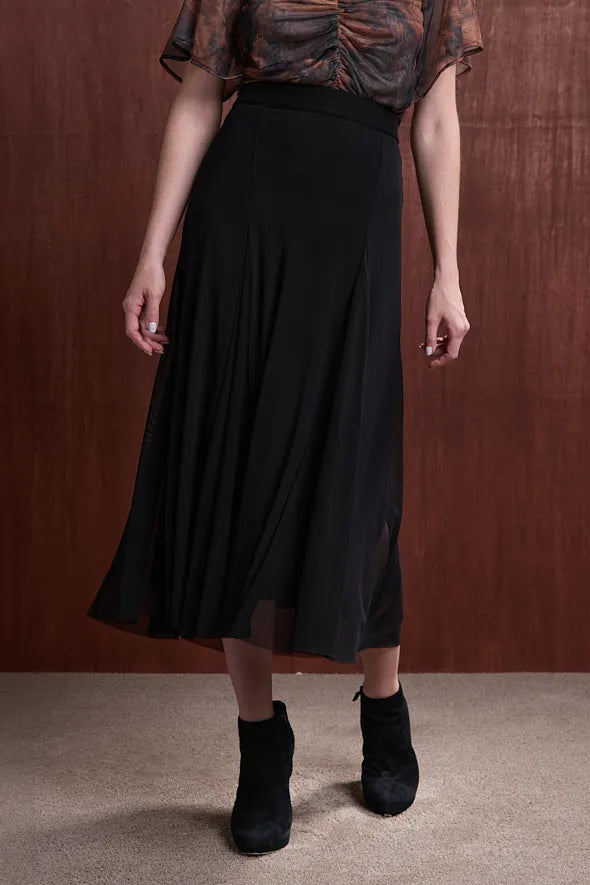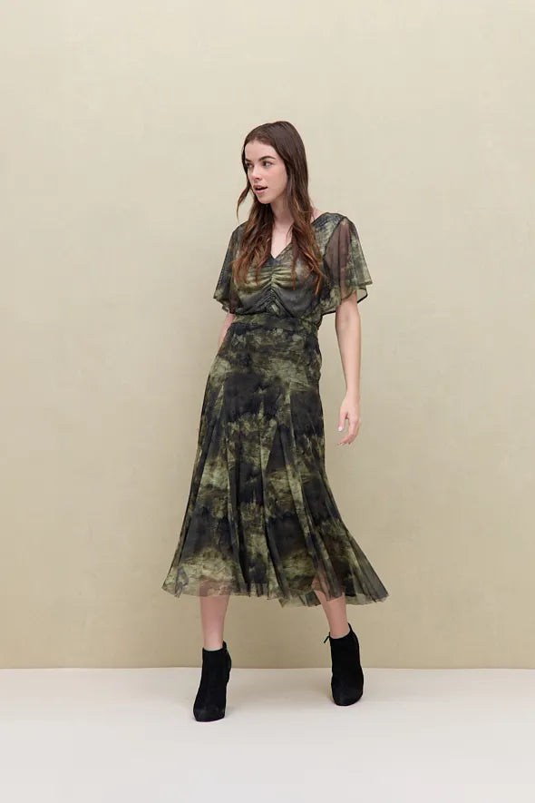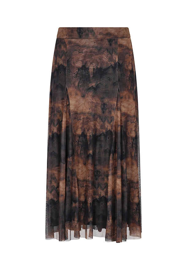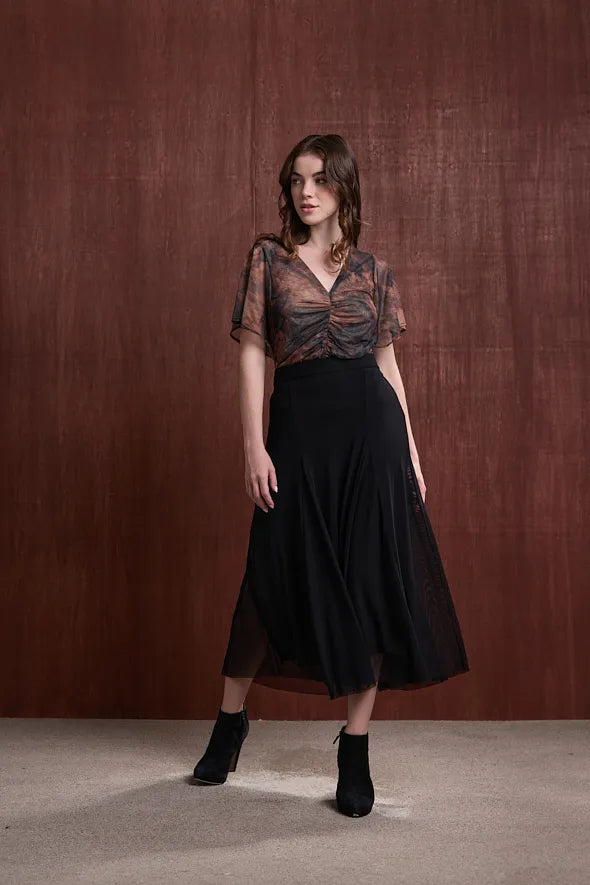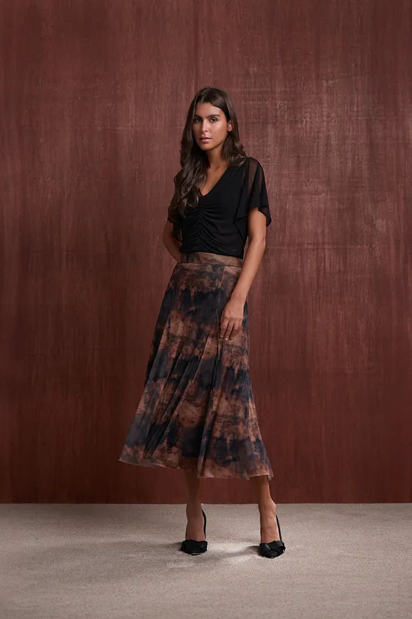 Fluidez, movimiento y textura se combinan en la Falda Viento. Confeccionada en mesh 100% poliéster, esta falda de caída ligera y efecto plisado crea una silueta etérea con un estampado artístico.