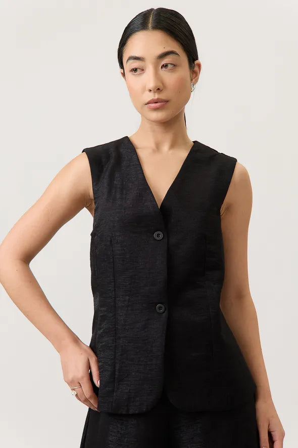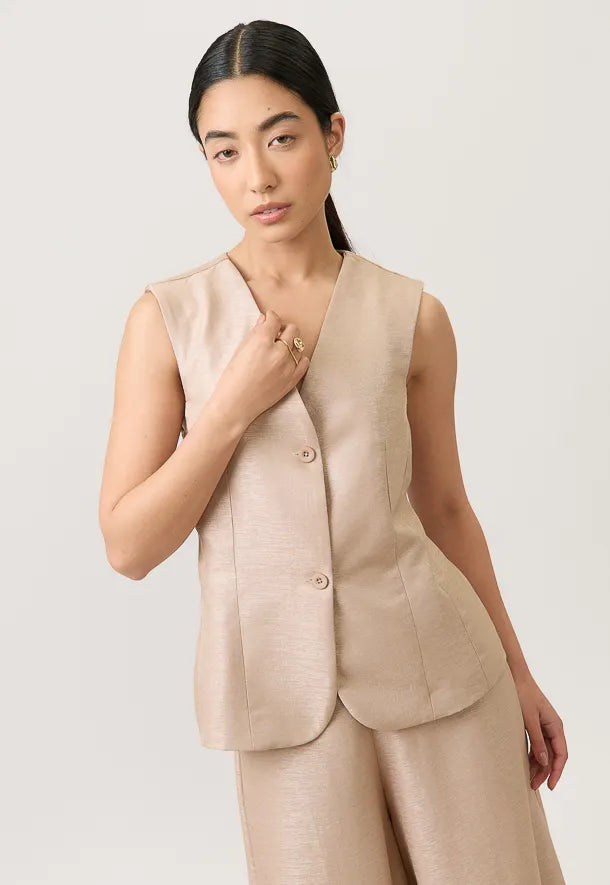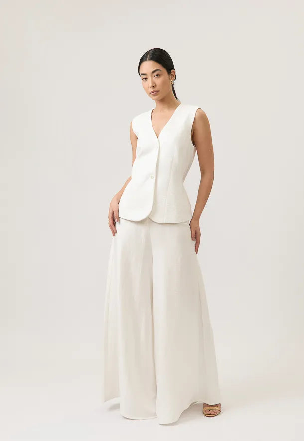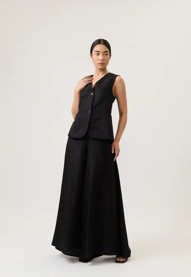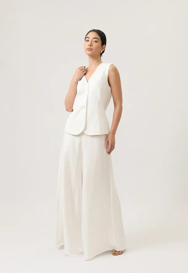 El chaleco estructurado realza la figura con líneas limpias y un fit impecable, mientras el pantalón de silueta amplia aporta movimiento y una caída fluida que estiliza y alarga la figura.