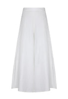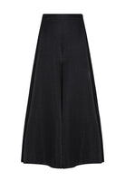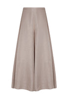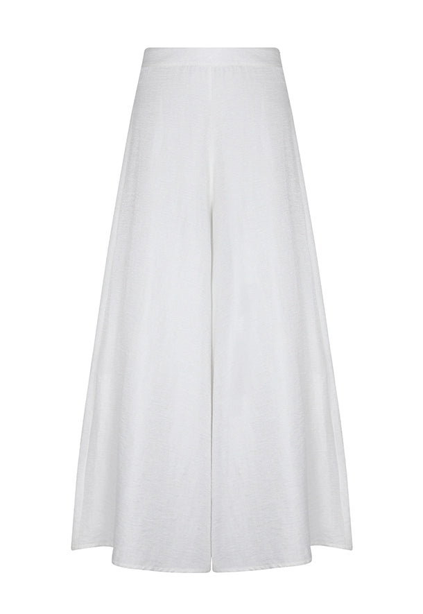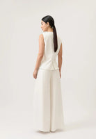El pantalón de silueta amplia aporta movimiento y una caída fluida que estiliza y alarga la figura.