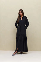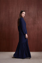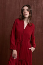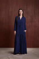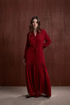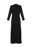 Con una silueta fluida y botones delanteros, esta prenda es perfecta para lograr un look sofisticado y versátil. Su corte largo con detalle de vuelo en la falda aporta movimiento y ligereza, mientras que el lazo en la cintura permite ajustarlo para realzar la figura. Las mangas largas y el cuello en V añaden un toque clásico, ideal tanto para ocasiones casuales como para eventos especiales. Fabricado en un tejido ligero y fresco, es la elección perfecta para quienes buscan un estilo refinado y sin esfuerzo.