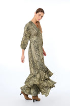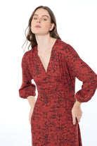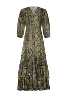 Confeccionado en rayón 100%, este vestido ofrece una caída suave y ligera que se adapta naturalmente al cuerpo, brindando frescura y comodidad en cada paso. El estampado tipo animal print en tonos neutros le da un aire salvaje y sofisticado a la vez.