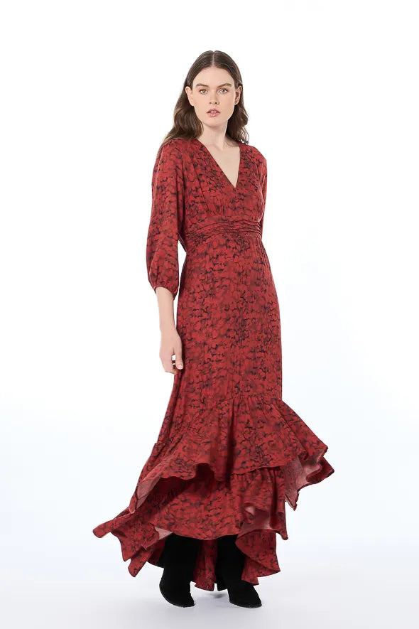 Fluido, audaz y con mucho movimiento. El Vestido Vuelos es una pieza que celebra el poder del print con una silueta femenina y llena de vida. Su diseño de largo asimétrico con volantes en el ruedo y escote en "V" lo convierte en el protagonista perfecto para looks versátiles con personalidad.