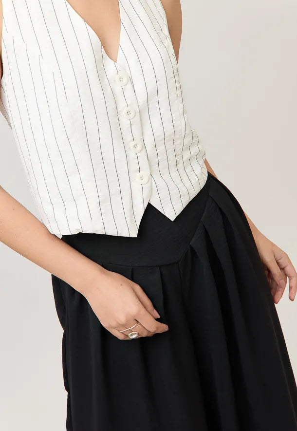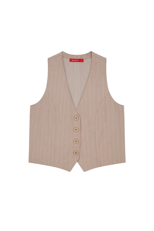 Un básico sofisticado que redefine la versatilidad. Confeccionado en un tejido ligero que ofrece frescura, resistencia y una textura delicada al tacto. Su diseño recto con cuello en “V” alarga la silueta y aporta un aire moderno y refinado, mientras que los botones al frente añaden un detalle clásico y atemporal. Ideal para llevar en conjunto con el Palazzo Elegante o como pieza independiente, este chaleco es perfecto para looks de oficina, cócteles relajados o para elevar un outfit casual con sobriedad y estilo.