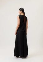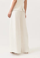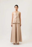 El chaleco estructurado realza la figura con líneas limpias y un fit impecable, mientras el pantalón de silueta amplia aporta movimiento y una caída fluida que estiliza y alarga la figura.