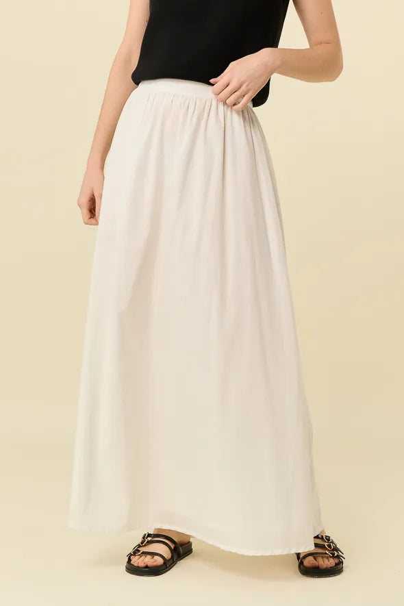 Ligera, fresca y eternamente versátil. La Falda Alba está confeccionada en una tela liviana con un movimiento suave que estiliza y acompaña cada paso. Su pretina elástica garantiza comodidad absoluta, mientras su caída amplia crea una silueta limpia y sofisticada.