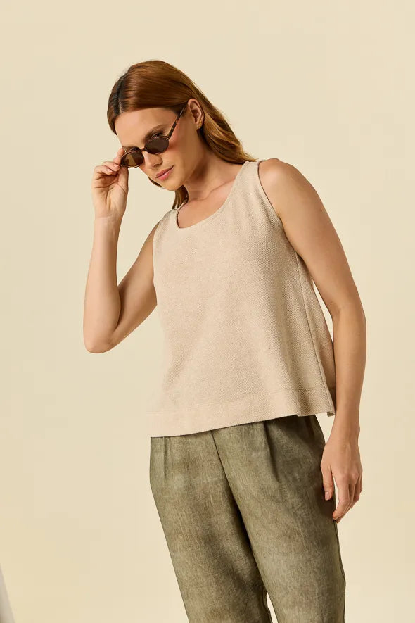 El Top Niza es la pieza esencial que eleva tus looks de temporada. Con un diseño minimalista y un acabado ligeramente texturizado, destaca por su caída suave y un abertura posterior que aporta movimiento, frescura y un toque sofisticado sin esfuerzo.