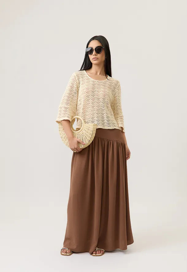 Una prenda femenina y sofisticada que aporta movimiento y ligereza a cualquier look. Su silueta fluida resalta la figura de manera natural, mientras que el diseño atemporal la convierte en un básico versátil de la temporada. Confeccionada en 100% poliéster, ofrece una caída suave, frescura y facilidad de cuidado, perfecta para acompañarte en el día a día o en ocasiones especiales. Ideal para combinar con el Top Calma o el Polo Calma y lograr un conjunto equilibrado y elegante.