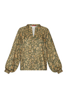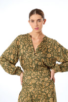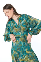 El diseño incluye mangas amplias con puños cerrados, una abertura frontal con botones nacarados y un cuello sutilmente estructurado, aportando un toque sofisticado sin esfuerzo. Ideal para usar tanto en ocasiones casuales como en eventos más especiales.