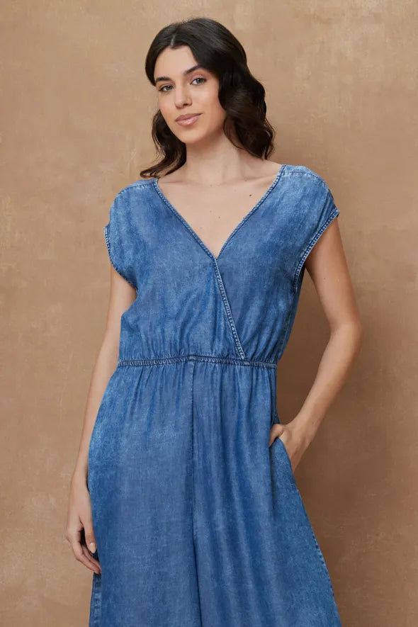 Un jumpsuit de estilo relajado y moderno confeccionado en tencel ligero y suave. Este diseño cuenta con una silueta de pierna ancha que aporta comodidad y fluidez, mientras que su escote en "V" cruzado añade un toque femenino. Perfecto para climas cálidos, este jumpsuit es una opción versátil para un look casual. pero elegante. El ajuste con cinturón elástico a la cintura realza la figura y garantiza una comodidad duradera durante todo el día.