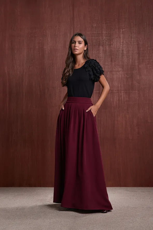 Nuestra falda Suspiro es la expresión perfecta de elegancia y movimiento. Con un diseño de cintura alta y delicados pliegues, aporta una silueta fluida y estilizada que realza la figura. Su corte largo y confección en un tejido ligero la convierten en una prenda versátil, ideal para looks sofisticados o casuales. Fácil de combinar con blusas estructuradas o tops ligeros, esta falda es una pieza imprescindible para quienes buscan un estilo atemporal con un toque de sofisticación.