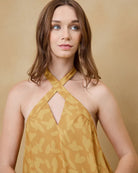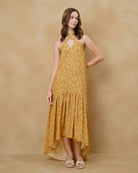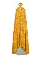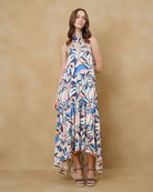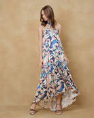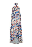 Destaca con este vestido largo de diseño fresco y elegante. Su cuello halter con escote cruzado resalta el área del busto, mientras que el corte asimétrico en la falda crea un movimiento fluido. Fabricado en tela ligera con un delicado estampado abstracto, este vestido es perfecto para eventos casuales o salidas de verano. Combínalo con sandalias planas o tacones para un look versátil y sofisticado.