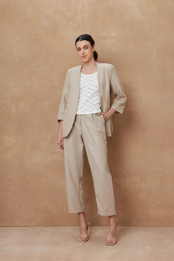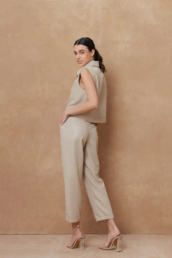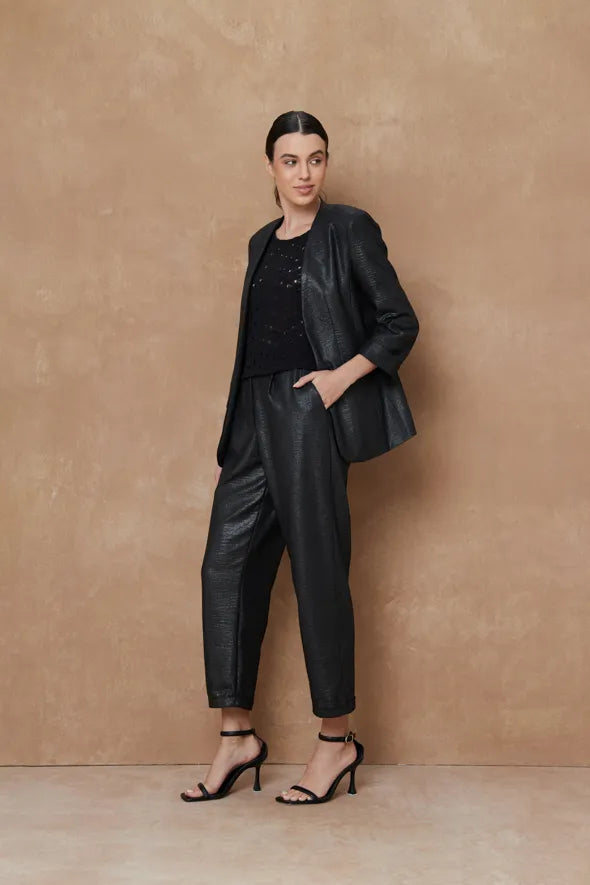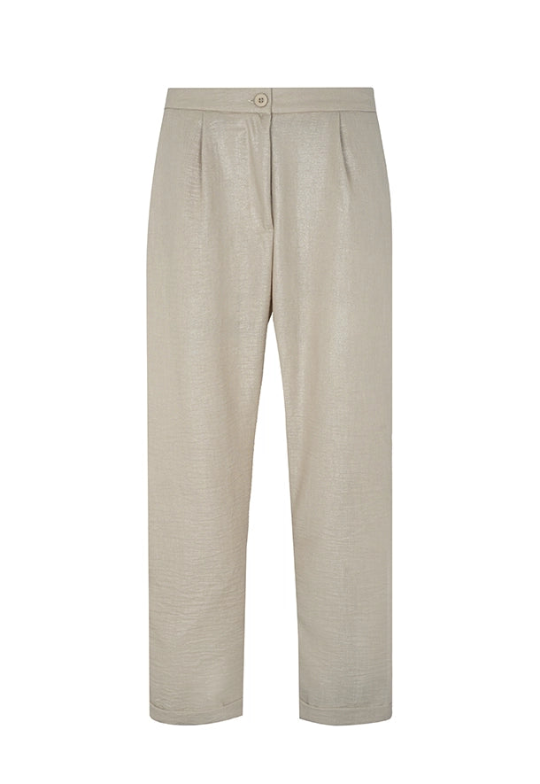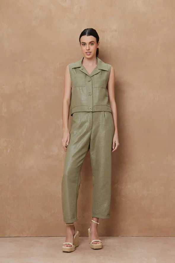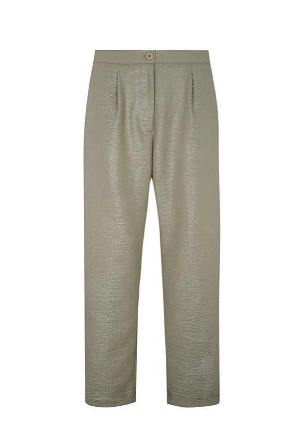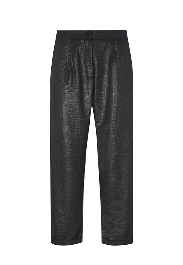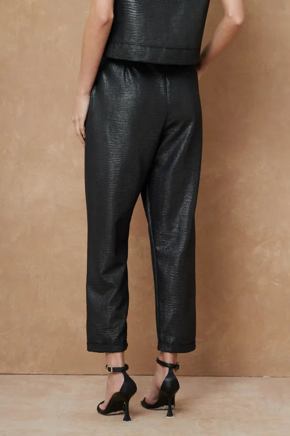 Dale un toque moderno a tu guardarropa con nuestro pantalón mar de acabado brillante. Diseñado para ofrecer comodidad y estilo, cuenta con un corte relajado y pinzas que añaden estructura y definición a la silueta. Su textura sutilmente brillante le confiere un aire sofisticado, ideal para eventos nocturnos o reuniones formales. Combínalo con tacones y una blusa sencilla para un look que no pasará desapercibido.