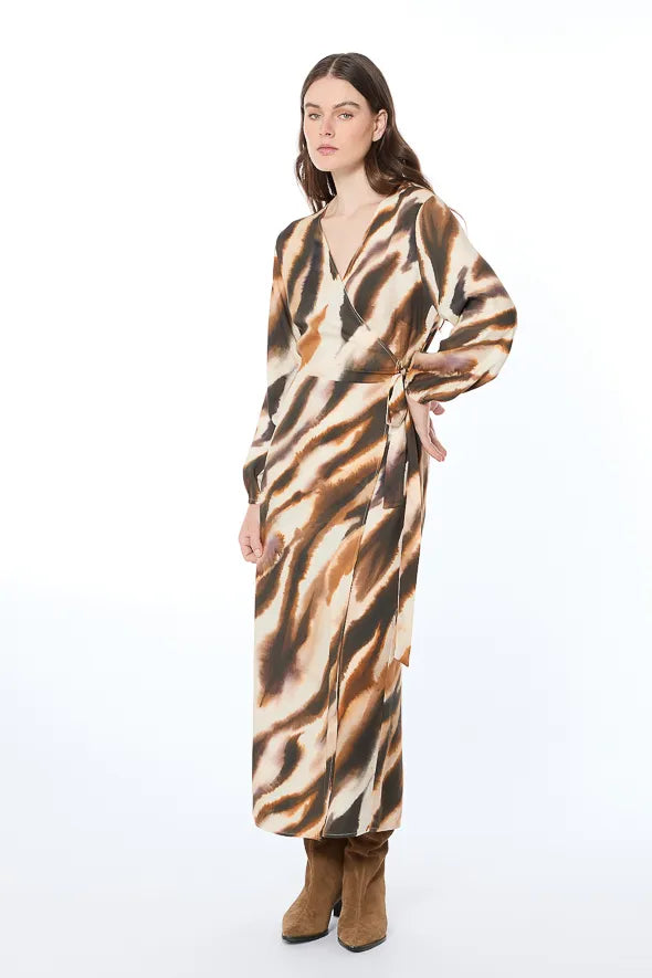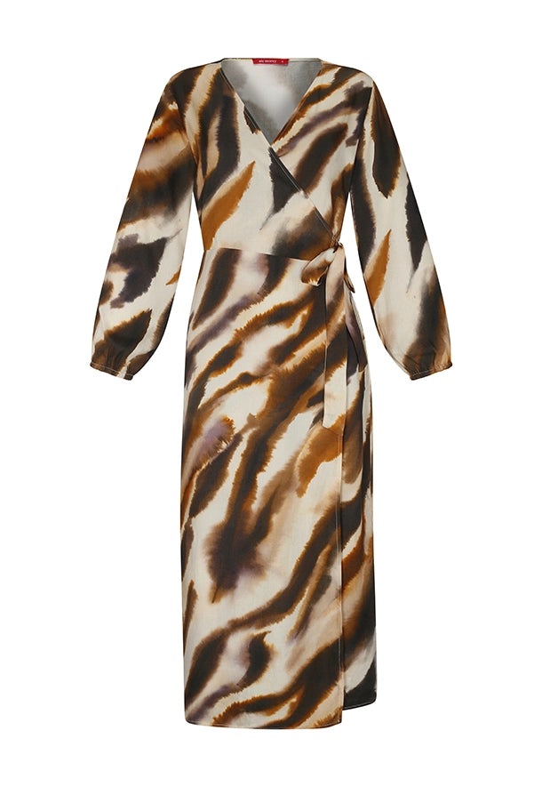 Descubre la elegancia sin esfuerzo con el Vestido Wrap. Confeccionado en 100% rayón, este vestido ofrece una textura suave y fluida que acompaña naturalmente el movimiento del cuerpo, brindando comodidad y estilo en cada paso. Su estampado artístico, inspirado en formas orgánicas y tonos tierra, transmite una conexión sutil con la naturaleza y aporta carácter a cualquier look.