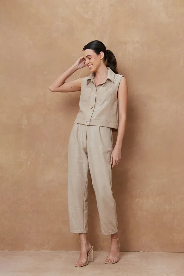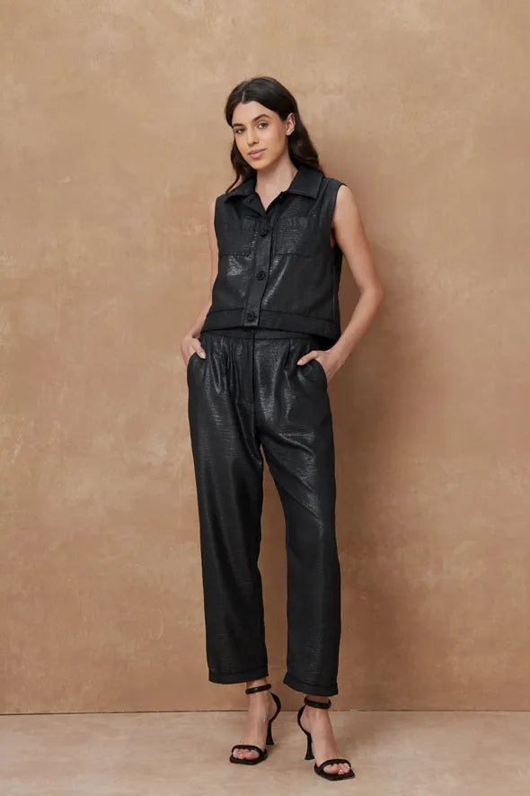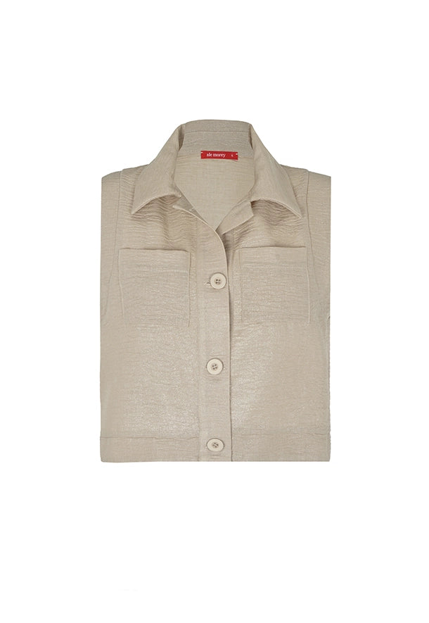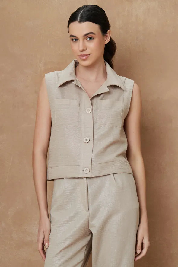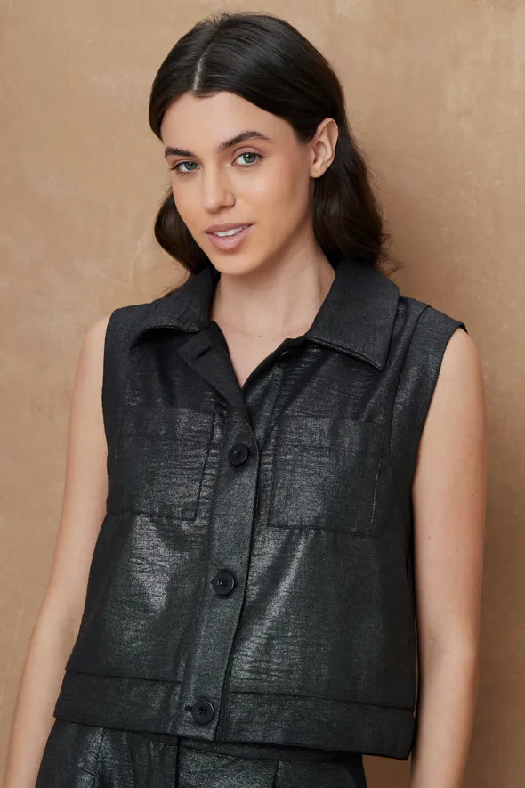 Este chaleco sin mangas está confeccionado con un elegante acabado metálico que agrega un toque de sofisticación y modernidad a cualquier look. Con un diseño estructurado, cuenta con bolsillos frontales de solapa y cierre de botones, lo que lo convierte en una prenda versátil y funcional. Su textura suave y brillante lo hace ideal para ocasiones formales o para elevar un atuendo casual. Combínalo con los pantalones a juego o úsalo con prendas neutras para destacar su diseño.