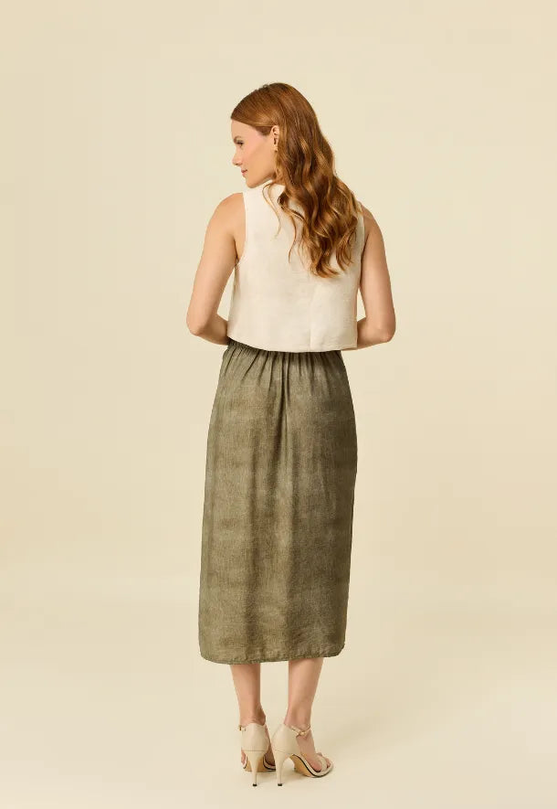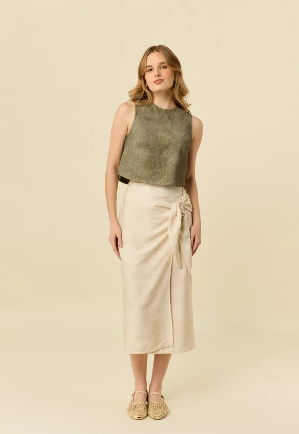 El Top Esencia es una pieza minimalista que destaca por su elegancia natural. Confeccionado en lino melange, ofrece una textura suave con un efecto visual orgánico que aporta profundidad y un estilo effortless.